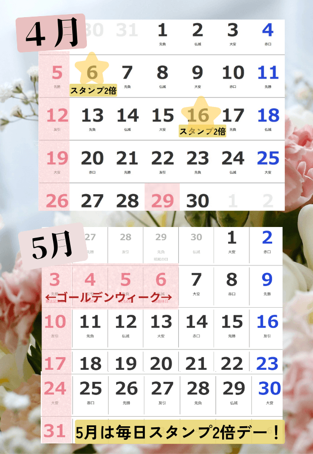♦︎5月は10周年を記念し『毎日スタンプ2倍‼︎』とさせていただきます。