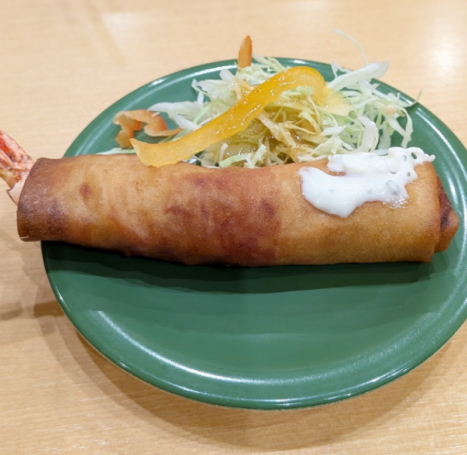 必ず頼む「大海老春巻き」を夫と1本ずつシェア。これ1本でもかなりボリューミー満腹でした。