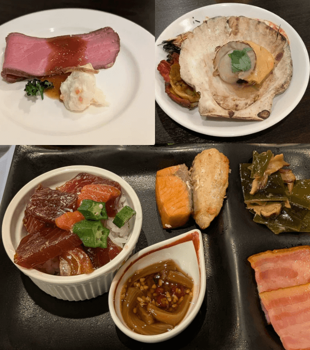 夕食バイキングは、マグロ丼やローストビーフ、イカの塩辛、ホタテ貝焼きなど海鮮モリモリ!