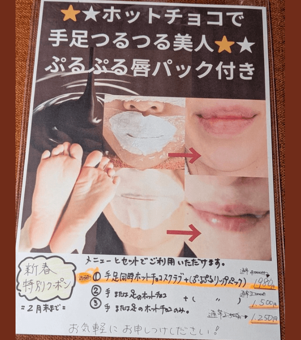 ホットチョコで手足の乾燥つるつる♪ぷるぷるウルる艶リップパック付き♡の内容
