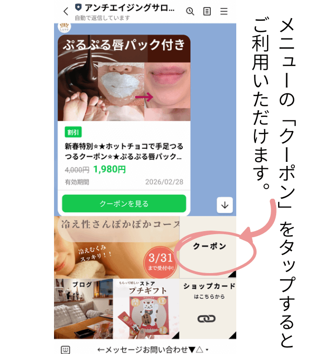 ①リュクスのLINEを開き→②メニューの中の「クーポンを見る」をタップしてご覧ください。